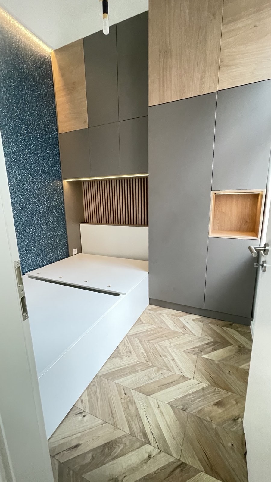 A látványtervek jóváhagyása után gyorsan egyeztettük a részleteket az ügyféllel, és már indulhatott is a gyártás. A teljes kivitelezés egy hónapon belül lezajlott. A tér praktikusan használható, jól átlátható, és nem kelti zsúfoltság érzetét – ideális belvárosi kis lakás a mesés fővárosba látogató vendégek számára!